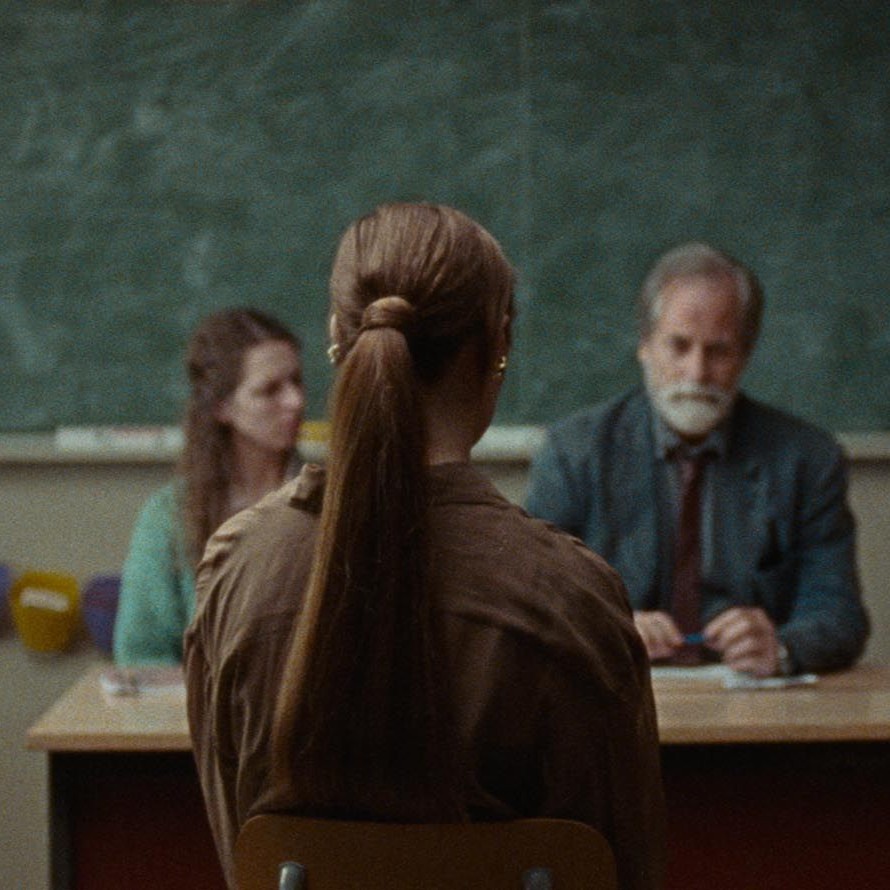 Déconcertant, le film l’est. Le premier plan augure son étrangeté : la caméra est sur la voiture d’Elisabeth, mais au lieu d’être à l’avant du capot comme cela est habituellement le cas, elle est placée à l’arrière du coffre. De plus, le travail du son est marqué, il est trop minutieux pour ne pas s’exposer à nous. Dans un cinéma moins expérimental, la bande sonore s’efface, elle sert les personnages et l’ambiance et excelle quand on l’oublie. Au contraire, la cinégraphie de La Convocation a renoncé à l’humilité : la sonnerie de récréation défaillante est, dès l’entrée dans l’école, trop présente, et notifiée comme telle. En soulignant la présence de ce son inconfortable à sa collègue, le directeur, au lieu de le justifier, invite le·a spectateur·ice à remarquer les moyens cinématographiques mis en place pour le faire exister. Le travail de l’image suit ce raisonnement. Le film crie que tout a été pensé, que rien n’a été laissé au hasard. Ce qui surprend est que ces procédés cinématographiques artificiels sont mis au service d’une intrigue qui appellerait plutôt une esthétique naturaliste. Il est intéressant alors de comparer La Convocation à Annette (Leos Carax, 2021). Là où Annette mettait le cinéma4 au service d’un drame extrême et de penchants fantastiques, La Convocation s’en sert pour un « fait divers » dont la banalité est rappelée dès les premiers dialogues.